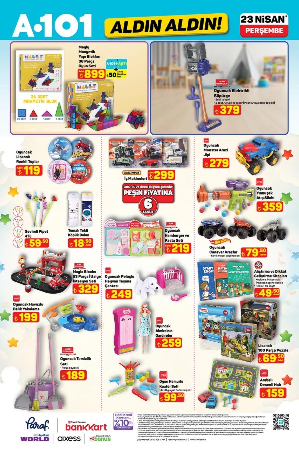 A101 aktüel yeni hafta kataloğu çıktı. 23 Nisan 2026 Perşembe günü satışa çıkacak olan aktüel ürünler listesinde kablosuz çocuk kulaklık, 15 jant bisiklet, dart seti ve daha birçok ürün yer alıyor. 23 Nisan Ulusal Egemenlik ve Çocuk Bayramı olması vesilesiyle çocuklara özel birçok ürün aktüel ürünler listesinde yer alıyor.