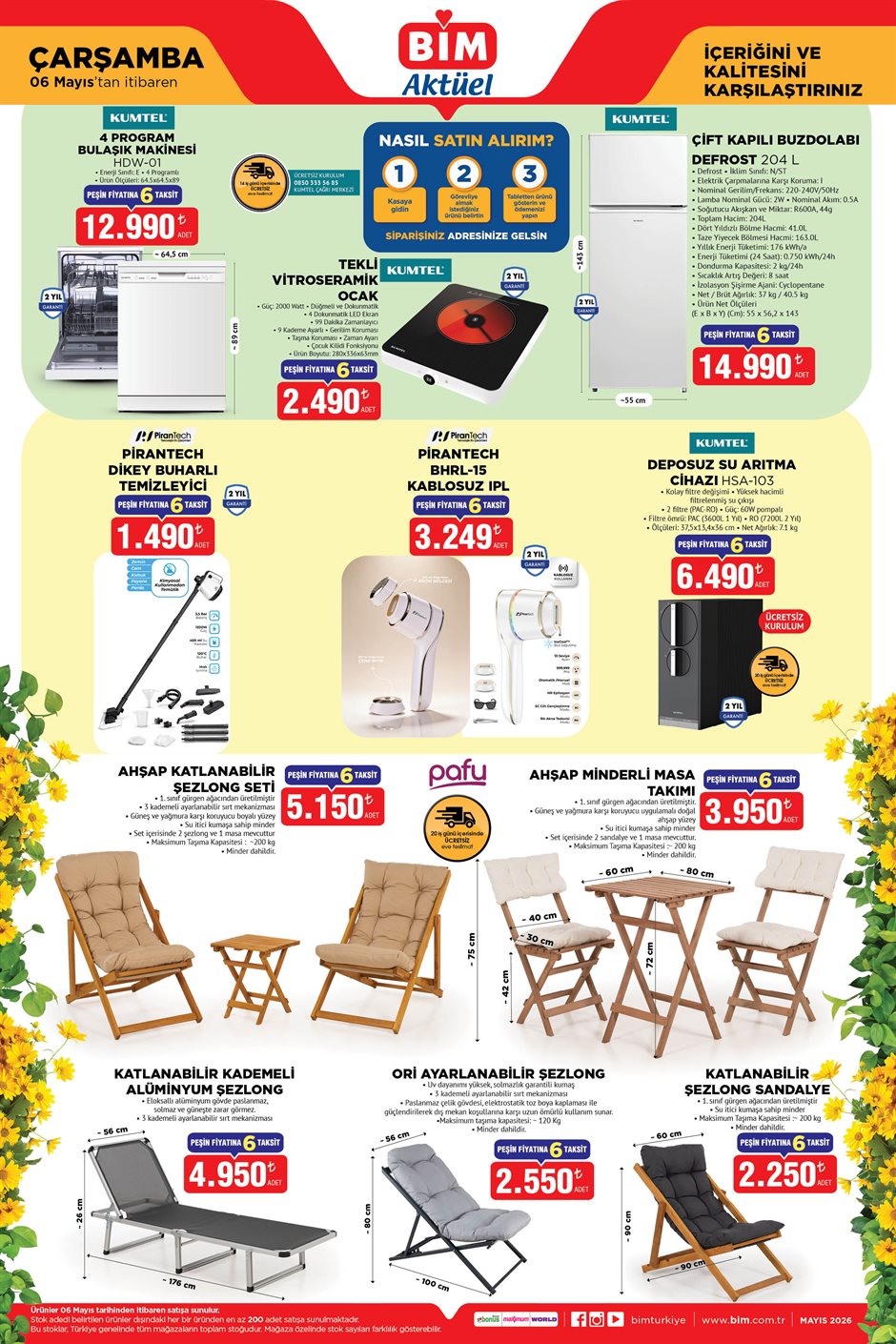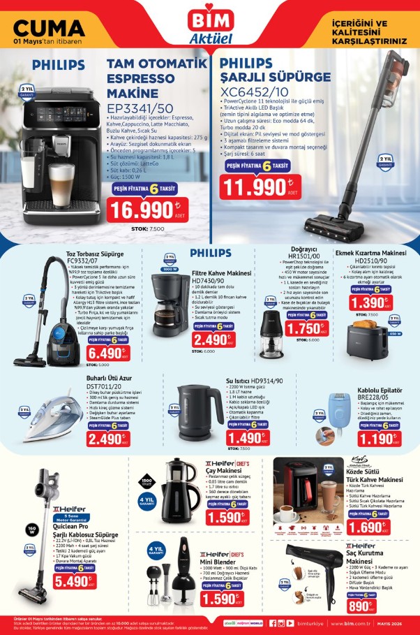 BİM aktüel Mayıs ayına özel kataloğunu yayınladı. Her hafta farklı ürünleri raflarında sergileyen zincir markette, 1 Mayıs 2026 Cuma itibarıyla kaçırılmayacak fırsatlar başlıyor. Şarjlı süpürge, doğrayıcı, su ısıtıcı, buharlı ütü, derin tencere ve karnıyarık tencere olmak üzere mutfak araç gereçleri öne çıkıyor. İşte, 1-5-6 Mayıs BİM aktüel ürünler kataloğu...