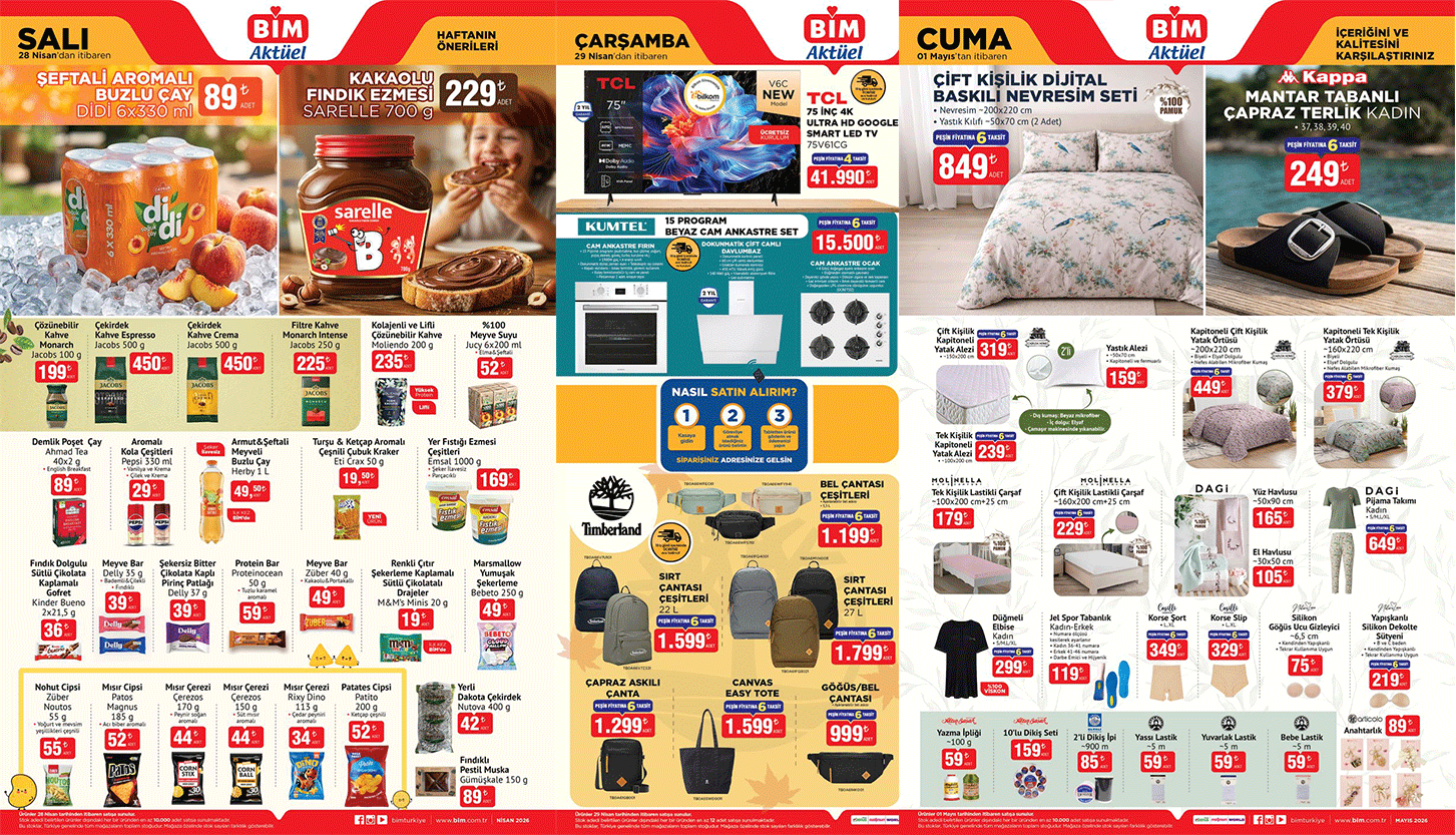 BİM aktüel ürünleri 28 Nisan - 1 Mayıs haftasında teknoloji tutkunlarından ev hanımlarına kadar herkesi heyecanlandıracak fırsatlar sunuyor. Nisan ayının son günlerinde başlayan ve Mayıs başına sarkan yeni indirim döneminde, espresso makinesinden ankastre setlere kadar pek çok ürün cazip fiyatlarla raflara iniyor. İşte yeni haftanın BİM kataloğu.