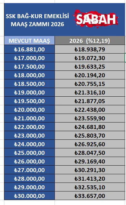 2026 yılı Ocak ayı emekli maaş artışı, Aralık enflasyon verilerinin açıklanmasının ardından kesinleşti. Son 6 aylık enflasyon farkı esas alınarak yapılan düzenleme kapsamında emekli aylıklarına yüzde 12,19 oranında zam uygulanacak. Bu artışla birlikte en düşük emekli maaşı 18.939 TL seviyesine yükseldi.Zam oranının netleşmesiyle birlikte, mevcut maaşı 16.811 TL, 17.000 TL ve 18.000 TL olan emekliler de yeni aylıklarının ne kadar olacağını hesaplamaya başladı.