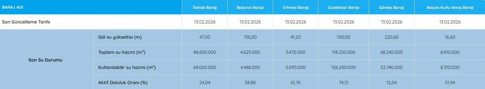 İzmir Su ve Kanalizasyon İdaresi (İZSU) verilerine göre, 13 Şubat 2026 Cuma günü barajlardaki genel doluluk oranı yüzde 36,19 seviyesinde kaydedildi.