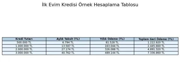 Öte yandan, yüzde 1,20 sabit faiz ve 180 ay vade üzerinden yapılan örnek hesaplamada ise tablo önemli ölçüde değişiyor. Bu senaryoda 1 milyon TL'lik "İlk Evim" kredisi için aylık taksit yaklaşık 13.587 TL seviyesinde olurken, toplam geri ödemenin 2.445.701 TL civarında gerçekleşmesi öngörülüyor. Böylece mevcut piyasa koşullarına kıyasla yaklaşık 1 milyon TL daha düşük bir toplam ödeme avantajı ortaya çıkıyor.