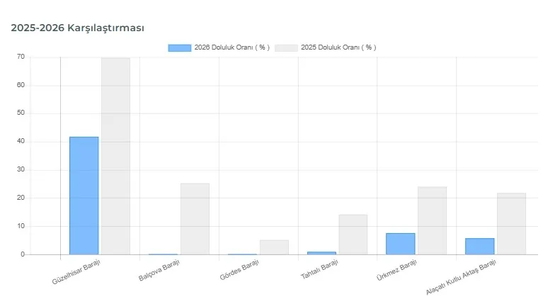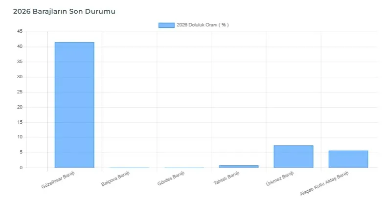 Veriler, İzmir'de barajlardaki su seviyesinin kritik düzeylerde seyrettiğini ortaya koyuyor. Kentin önemli su kaynaklarından biri olan Güzelhisar Barajı, diğer barajlara kıyasla görece yüksek bir doluluk oranına sahipken, Balçova ve Gördes barajlarında su seviyesinin yok denecek kadar düşük olduğu görülüyor. Tahtalı, Ürkmez ve Alaçatı Kutlu Aktaş barajlarında da doluluk oranlarının tek hanelerde kalması, İzmir'de su yönetiminin önümüzdeki süreçte daha da önem kazanacağını gösteriyor.
