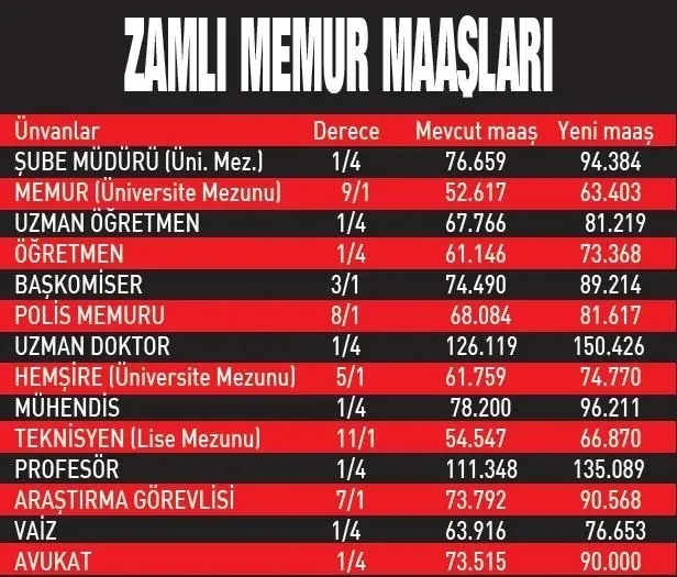 Zam sonrası bazı kamu görevlilerinin maaşları ise şu şekilde oldu: