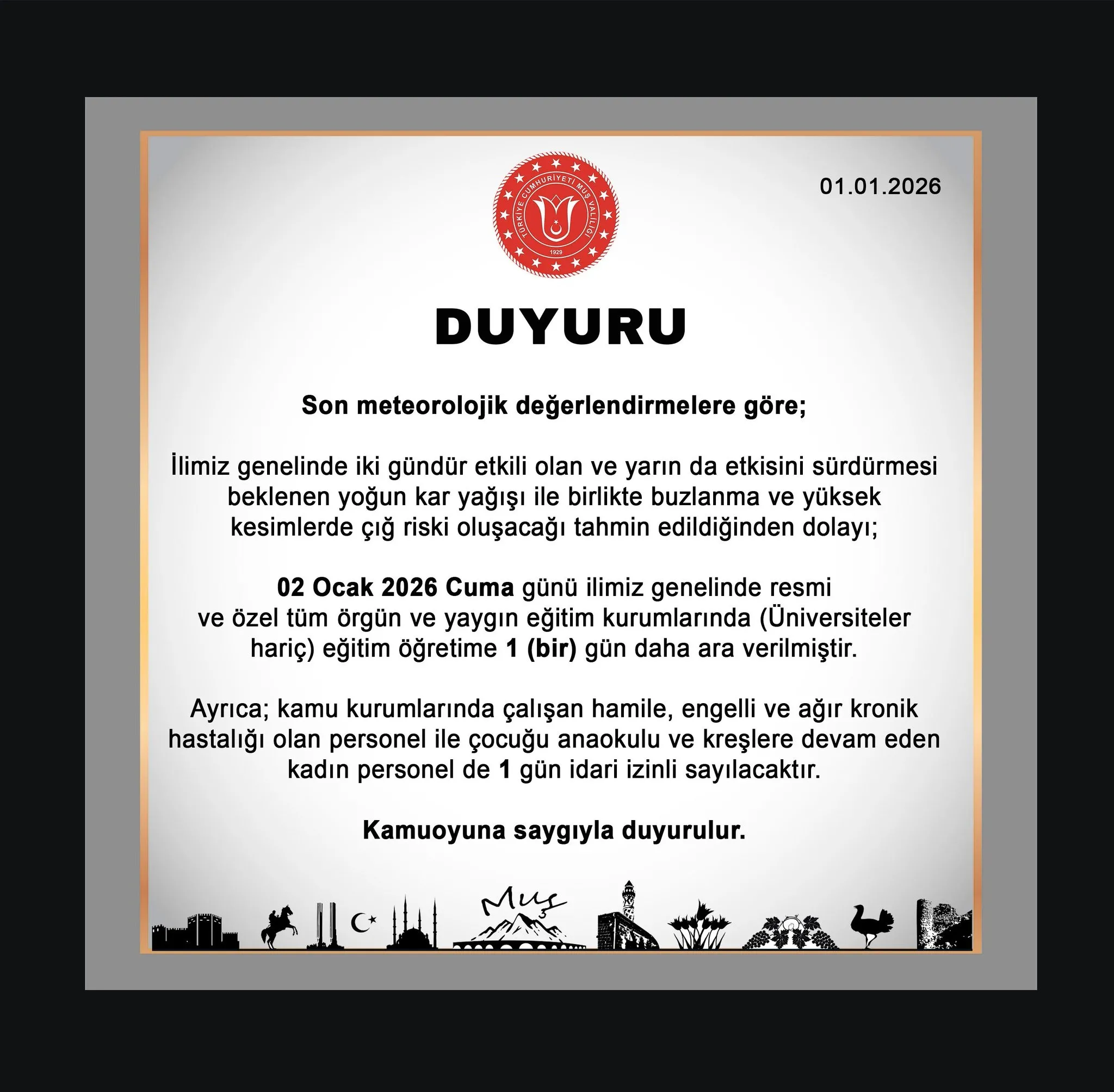 Muş Valliliği tarafından yapılan açıklamayla 2 Ocak Cuma günü okullar tatil edildi.