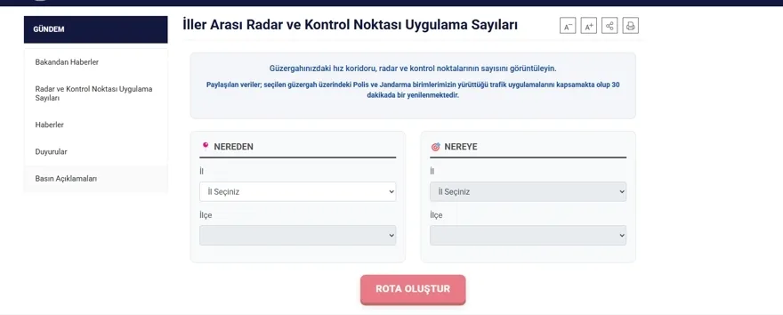 Bu alanlar yola çıkılacak il ve ilçe, gidilecek il ve ilçe şeklinde doldurulduktan sonra "Rota oluştur"a basılıyor ve ardından rota üzerindeki radar, hız koridoru ve kontrol noktaları tek tek sıralanıyor.