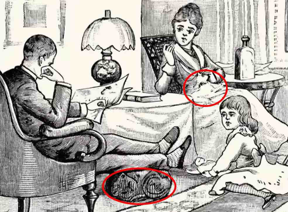 Peki bu optik illüzyonda neler var? Çizimde, bir ailenin birlikte vakit geçirdiği sıradan bir oda sahnesi yer alıyor. Anne sandalyede dinlenirken, baba gazete okuyor, küçük kız ise oyuncağıyla meşgul. Oda oldukça düzenli; masanın üzerinde lambalar ve kitaplar dikkatlice yerleştirilmiş durumda.