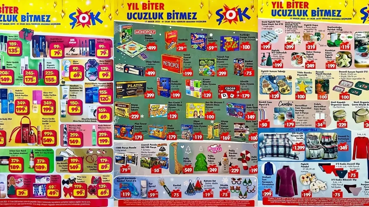 ŞOK Market'in 17 Aralık–1 Ocak tarihlerini kapsayan yeni aktüel kampanyaları alışveriş tutkunlarının ilgisini çekti. Yayımlanan katalogda özellikle kozmetik ürünlerindeki indirimler öne çıkarken, yıl sonuna özel fırsatlar da dikkat çekiyor. Kuru yemişten ev tekstiline, yılbaşı süslerinden oyuncak ve oyun çeşitlerine kadar birçok ürün avantajlı fiyatlarla raflardaki yerini alıyor. İşte 17 Aralık–1 Ocak ŞOK aktüel ürünleri ve öne çıkan indirimler…