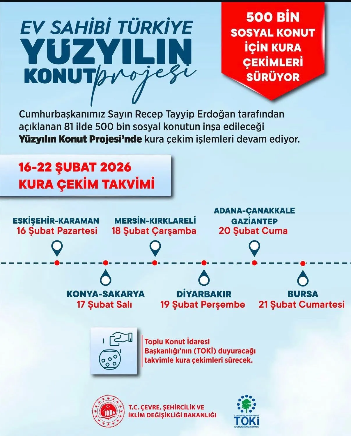 Bakan Murat kurum tarafından paylaşılan takvime göre TOKİ Bursa kura çekimi, 21 Şubat 2026 Cumartesi günü noter huzurunda gerçekleştirilecek.