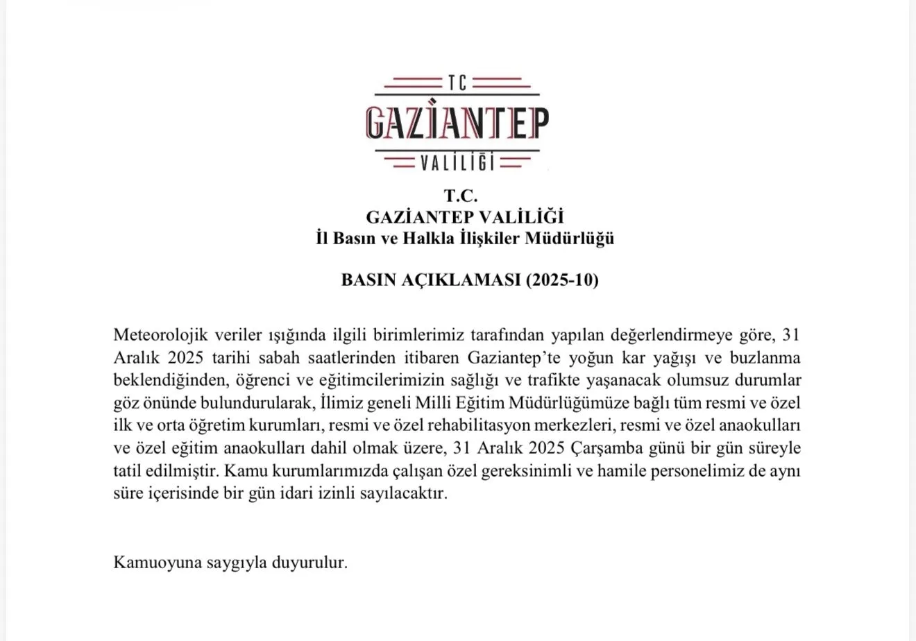 31 Aralık Çarşamba günü Gaziantep'te okulların tatil edilip edilmeyeceği merak konusu oldu. Kar yağışı ve olumsuz hava ihtimali nedeniyle valilikten gelecek açıklama beklenirken, Gaziantep Valiliği konuya ilişkin kararını kamuoyuyla paylaştı. Peki yarın Gaziantep'te okul var mı, yok mu?