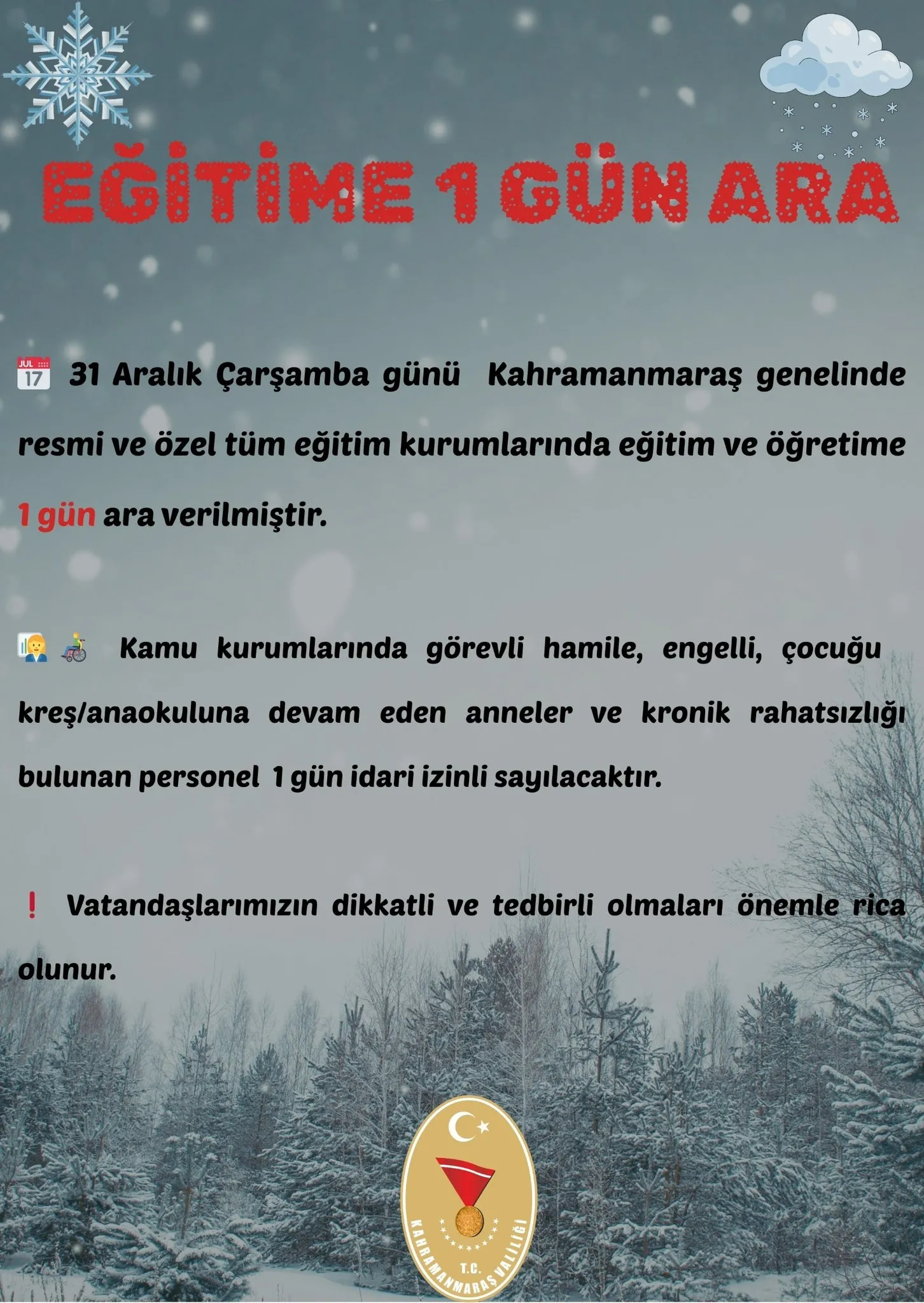31 Aralık Çarşamba günü Kahramanmaraş genelinde resmi ve özel tüm eğitim kurumlarında eğitim ve öğretime 1 gün ara verilmiştir.