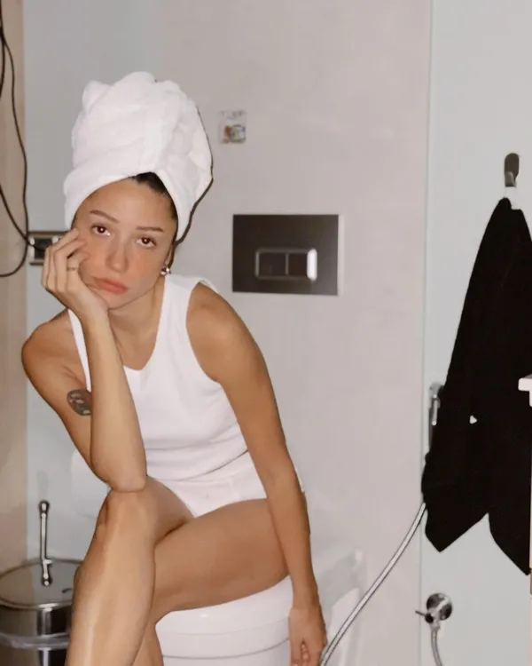 Tuvaletteki pozlarına gelen yorumları umursamayan ünlü şarkıcı bu sefer de beyaz iç çamaşırıyla ve başındaki havlusuyla klozet üzerine çıktı.