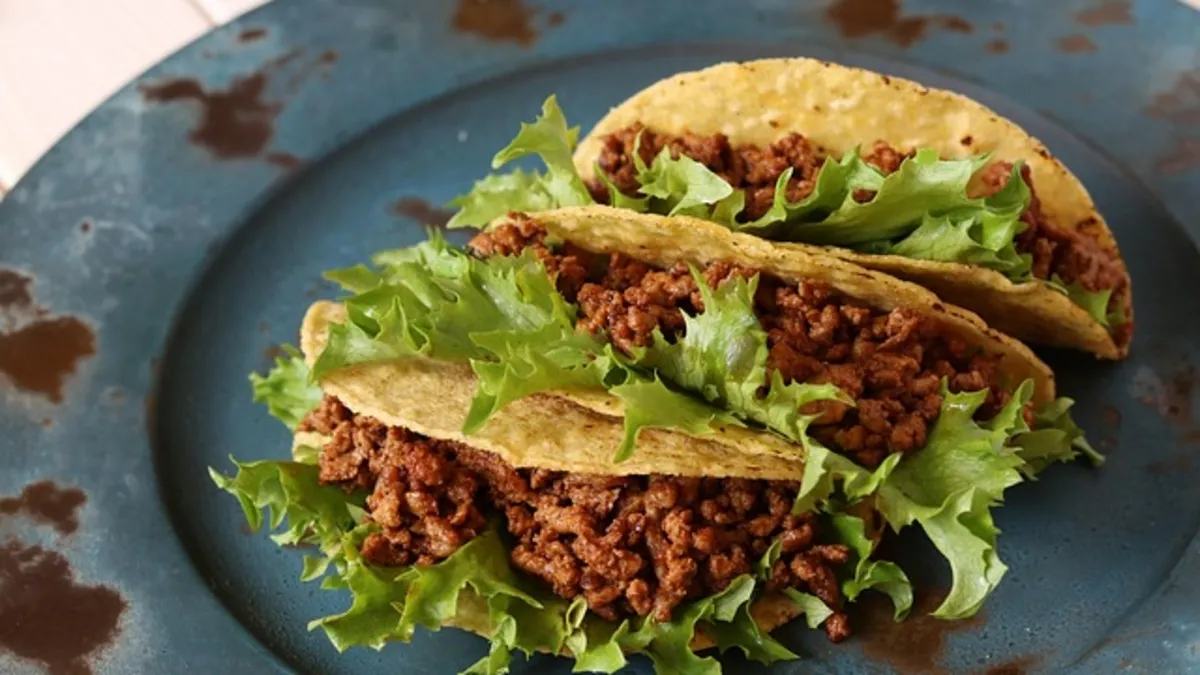 - Isınmış taco kabuğunun tabanına bolca kıymalı harçtan koy.