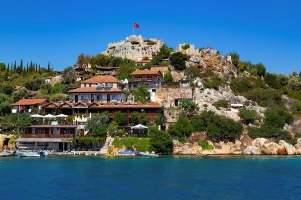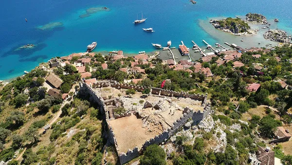 Kıyıdaki salaş iskelelere yanaşan yatlardan Kaleköy'e çıkan Akdeniz tutkunları, önce kıyıdaki sığ sularda yüzen, sessizliğe alışan caretta carettaları görüyor. Ardından denizin içindeki Türkiye'nin simgelerinden biri olan Likya lahdi Kaleköy'e ayrı bir tarihi zenginlik katıyor. Yukarı doğru tırmanarak denizden 300 metre yüksekliğindeki tarihi kaleye çıkınca ortaya çıkan muhteşem doğal ve tarihi güzellik bulunuyor. Tarihi Roma Kalesi'nde dalgalanan dev Türk bayrağı, kaleye çıkanları selamlıyor. Yukarı tırmanırken kayalara oyulmuş ve kalenin dışında çok sayıda Likya lahdi yer alıyor. Geçen yıl hizmete giren tarihi Kaleköy Camii ise yukarı tırmananların ilgi odağı haline gelmiş durumda.