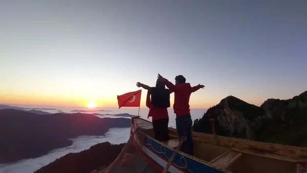 Ziyaretçiler, Kandemir'in yaylanın zirve noktasına yerleştirdiği kayıkta manzaraya karşı fotoğraf çektiriyor.