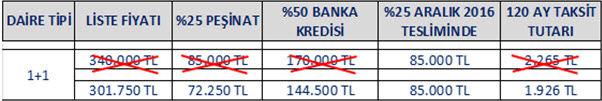 Kampanya kapsamında Vitrin projesinde örneğin; 1+1 340 Bin TL'lik daireler 301.750 TL'ye satışa sunuluyor. Müşteriler 1+1 ev bedelinin %25'i olan 85.000 TL peşinat yerine kampanya fiyatı olan 301.750 TL'nin %25'i olan 72.250 TL'yi peşinat olarak ödeyip ev sahibi olabilecekler. Ev bedelinin %50'sini banka kredi olarak kullanabilecek ve 120 ay 1.926 TL ödeyebilecekler. Aralık 2016'da evini teslim alacak müşteriler 85.000 TL ödeme gerçekleştirerek ödemelerini tamamlayabilecekler.