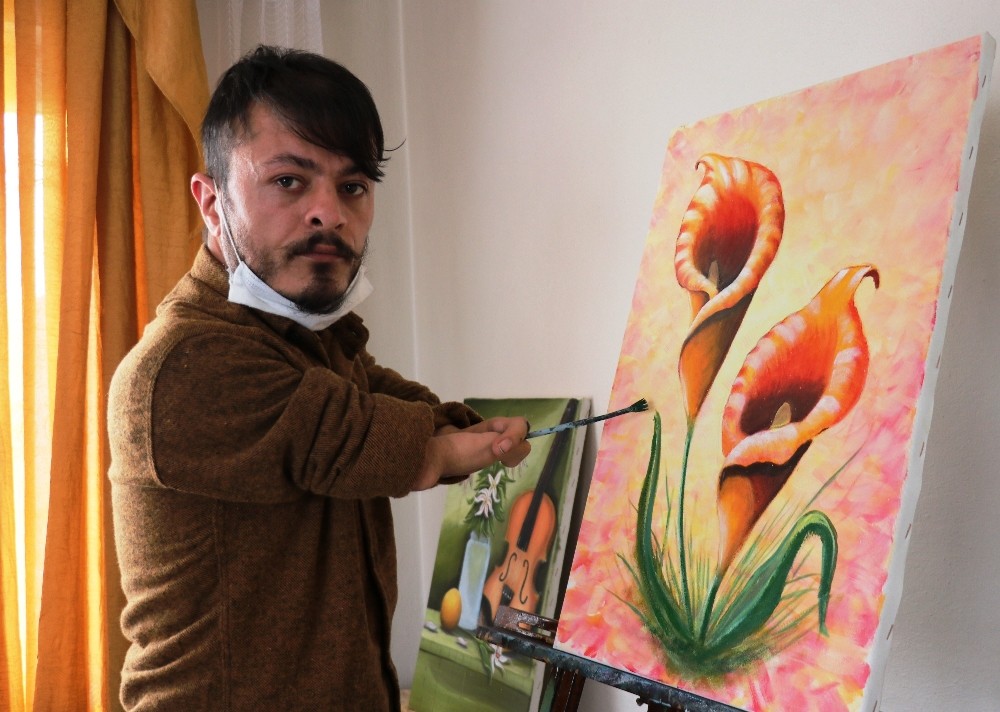 Van’ın Edremit ilçesinde yaşayan ve doğuştan elleri olmayan Vedat Kiyat, babasının şehit edilmesinin ardından yalnızlığını resimlerle gideriyor. Edremit ilçesine bağlı Eminpaşa Mahallesi’nde ikamet eden ve doğuştan iki eli olmayan fiziksel engelli Vedat Kiyat, 8 yaşındayken babasının şehit edildiğini ve o günden sonra kendini resim çizmeye adadığını söyledi. Babasının şehit edilmesinin ardından yalnız kaldığını ifade eden Kiyat, “Resim merakım babam şehit olduktan sonra başladı. Babam şehit olduktan sonra kendimi çok yalnız hissettim. Sadece annem ve kardeşim vardı. Başımızda kimse yoktu. Ben de kendimi hep yalnız hissediyordum. Ondan sonra resim çalışmalarına başladım. Resim yapmak beni mutlu ediyor. Kızgın, sinirli veya çok mutlu olduğum zamanlar resim çiziyorum. Stres için birebir olduğunu düşünüyorum” dedi. Göze güzel görünen her şeyi çizmeyi sevdiğini belirten Kiyat, “Eskiden karakalem çalışıyordum. Kuş veya herhangi bir hayvan gördüğümde ona iyice bakar, sonra da onu resme aktarırdım” ifadelerini kullandı.