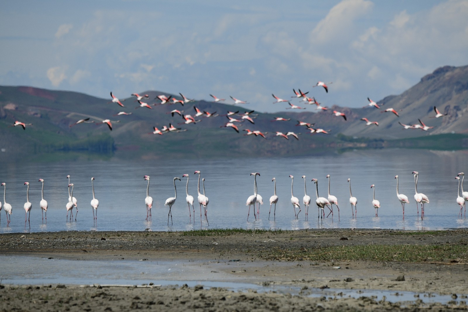 Van Gölü Havzası’nda bulunan sulak alanlara her yıl belirli dönemlerde renk katan flamingoların bu yıl yine geldiği Erçek Gölü kıyısında görsel şölenleri ‘sessiz’ devam ediyor Her yıl İran’ın Urmiye Gölü’nden gelerek Van Gölü Havzası’nda bir süre konakladıktan sonra Afrika ülkelerine göç eden flamingolar, bu yıl büyük gruplar halinde İpekyolu ilçe sınırında yer alan Erçek Gölü ile Muradiye Bendimahi Çayı’nı mesken tuttu. Zengin kuş popülasyonuyla kuş cenneti olarak anılan Erçek Gölü çevresinde görülen flamingolar, kıyı şeridini adeta beyaza bürüdü. Türkiye’deki yaklaşık 450 kuş türünden yaklaşık 250’sine ev sahipliği yapan Van Gölü Havzası’nda görüntülenen flamingolar, görüntüleriyle göz kamaştırıyor. Havaların ısınmasıyla birlikte Van Gölü Havzası’nda birçok noktaya gelen flamingolar her yıl düzenli olarak ilkbahar aylarında gelip, kasım ayına kadar havzada konaklıyor. Bu yıl ise korona virüs tedbirleri kapsamında 17 günlük tam kapanmadan dolayı Eflamingoların görsel şöleni sessiz devam ediyor.