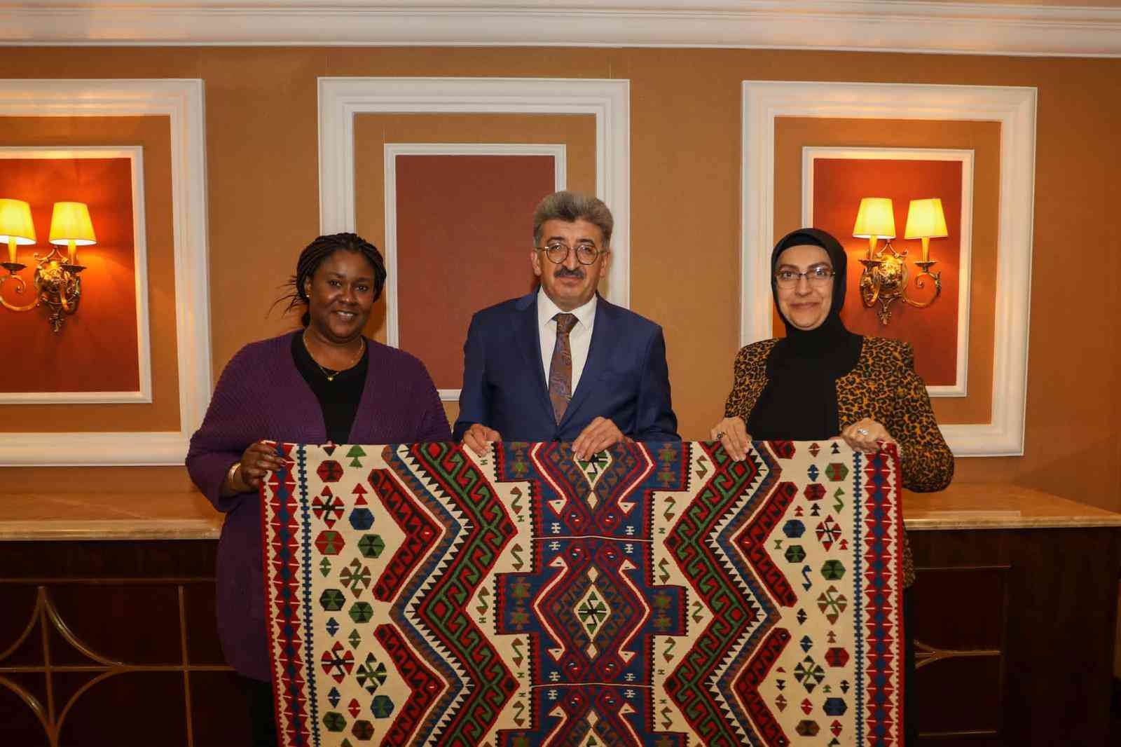 Kursiyerler ise kendilerini ziyarete gelen büyükelçi ve büyükelçi eşlerine el emeği ürünlerden hediye ederek hatıra fotoğrafı çektirdi.