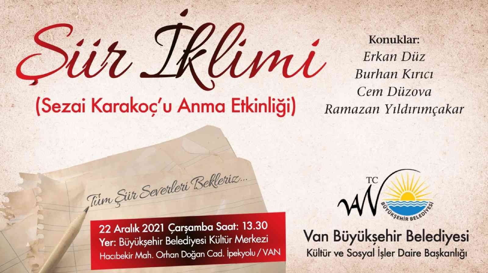 Kültür ve Sosyal İşler Daire Başkanlığı bünyesinde şair, yazar ve ses sanatçılarının katılımıyla gerçekleştirilen “Şiir İklimi’’, bu hafta Sezai Karakoç’u anısına düzenlenecek. Hacıbekir Kültür Merkezinde yapılacak olan programda; Erkan Düz, Burhan Kırıcı, Cem Düzova ve Ramazan Yıldırımçakar konuk şair olarak yer alacak.