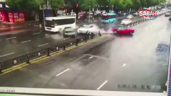 Çin’de kadın sürücünün kullandığı lüks otomobil, bariyerleri yıkan cipe çarptı. Çin’de kadın sürücünün kullandığı lüks otomobil, yağmur nedeniyle kayganlaşan yolda kontrolden çıktı. Bariyerleri yıkan araç bir cipe, cip de başka bir otomobile çarptı.
