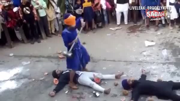 Hindistan’ın güneyinde Sih bayramında düzenlenen bir gösteride kan donduran bir olay yaşandı. ‘Dövüş sanatları ustası’ olduğu belirtilen bir adam, gözleri bağlı bir şekilde, yere yatmış iki gönüllünün etraflarına koyan meyveleri elindeki balyozla parçalıyor. Etrafa toplanan kalabalık ise ilgi çekici bu gösteriyi merakla izliyor. Ancak bir an geliyor ki ‘dövüş sanatları’ ustası elindeki balyozu yanlış hesap yaparak, arkadaki adamın kafasına vuruyor.