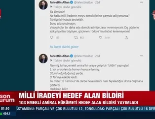 103 emekli amiral, hükümeti hedef alan bildiri yayımladı. İletişim Başkanı Fahrettin Altun aralarında; Türker Ertürk, Deniz Cora’nın da bulunduğu 103 emekli amiralin AK Parti Hükümeti’ni hedef alan bildiri yayınlamasına tepki gösterdi. Tüm detaylar A Haber'de...
