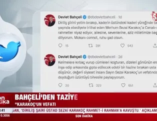 Milliyetçi Hareket Partisi Genel Başkanı Devlet Bahçeli de sosyal medya hesabından bir paylaşımda bulunarak, "Kelimelere kırbaç vurup cümleleri koşturan, dizeleri gönlünün enginliğiyle inşa edip arkasında gıpta edilecek edebi bir hazine bırakan usta şair, saygın düşünür, değerli siyaset insanı Sayın Sezai Karakoç'un vefatından duyduğum üzüntüyü bilvesile paylaşıyorum. Diriliş şiirini yetim bırakıp, kaderin üstündeki kaderi yüreğinde taşıyarak 88 yaşında ebediyete irtihal eden Merhum Sezai Karakoç'a Cenab-ı Allah'tan rahmetler niyaz ediyor, ailesine, sevenlerine, aziz milletimize başsağlığı diliyorum. Mekanı cennet, ruhu şad olsun"