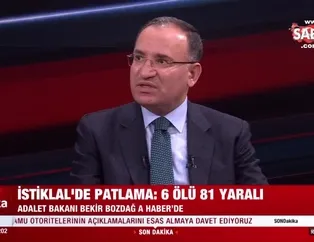 Son dakika haberi: Adalet Bakanı Bekir Bozdağ, A Haber'de Beyoğlu'nda meydana gelen patlamaya ilişkin açıklamalarda bulunuyor. Bakan Bozdağ, patlamaya ilişkin şüpheli bir kadının olduğunu belirterek, "Bir kadın bankta 40 dakika kadar oturuyor, kalktıktan bir süre sonra patlama oluyor. Şu anda o kadınla ilgili tüm veriler inceleniyor." dedi.