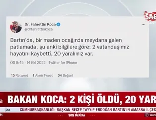 Son dakika bilgisine göre Bartın'ın Amasra ilçesinde maden ocağında patlama meydana geldi. Bartın Valiliği tarafından yapılan açıklamaya göre patlama, saat 18.15 sıralarına eksi 300 kotunda gerçekleşti. Patlama nedeniyle bölgeye çok sayıda ekip sevk edilirken Bartın Valisi Nurtaç Arslan, yer altında 49 işçinin olduğunu bildirdi. Sağlık Bakanı Koca, patlamada 2 vatandaşın hayatını kaybettiğini 20 kişinin ise yaralandığını duyurdu. Bartın Cumhuriyet Başsavcılığı tarafından da patlamaya ilişkin soruşturma başlatıldı.