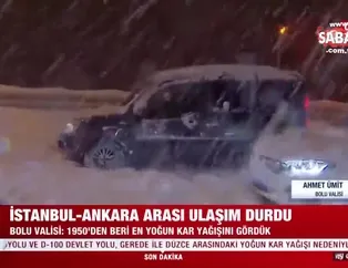 Son dakika haberi! Türkiye'nin büyük bir bölümü şiddetli kar yağışının etkisi altına kalırken, özellikle Bolu'da hayat durma noktasına geldi. Yüzlerce araç ve vatandaş trafikte mahsur kalırken, Bolu Valisi Ahmet Ümit kentteki son durumu aktardı. Vali Ümit yaptığı açıklamada 1950 yılından beri en yoğun kar yağışının yaşandığını aktardı ve "Düzce-Gerede arası otoyol ve devlet yolu yoğun kar ve tipiden dolayı kapanmış olup, kar ve buz mücadelesi çalışmaları devam etmektedir. Bu nedenle İstanbul-Ankara, Ankara-İstanbul İstikametlerinde yeni bir duyuruya kadar yola çıkılmaması gerekmektedir" dedi.