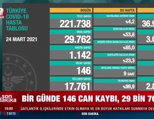 Son dakika haberleri: Sağlık Bakanlığı, 24 Mart koronavirüs verilerini "covid19.saglik.gov.tr" adresinden paylaştı. Sağlık Bakanlığı son 24 saatte 146 vatandaşımızın hayatını kaybettiğini, 29 bin 762 yeni vaka olduğunu açıkladı. Ağır hasta sayısı 1720 oldu, 17 bin 761 kişinin Kovid-19 tedavisinin/karantinasının sona ermesiyle iyileşen sayısı 2 milyon 881 bin 643'e yükseldi.