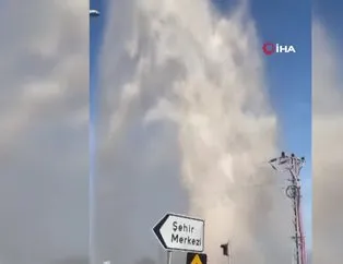Sivas’ın Suşehri ilçesinde içme suyu borusunun patlaması sonucu fışkıran su metrelerce yükseğe ulaştı. O anlar cep telefonu kamerasına yansıdı.
