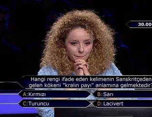 'Kim Milyoner Olmak İster?' 19 Kasım 2019 Pazartesi gecesi yayınında Kenan İmirzalıoğlu'nun sorduğu 'Hangi rengi ifade eden kelimenin Sanskritçeden gelen kökeni "kralın payı" anlamına gelmektedir?' sorusu programa damga vurdu! İşte Sanskritçede kökeni "kralın payı" anlamına gelen o kelime...