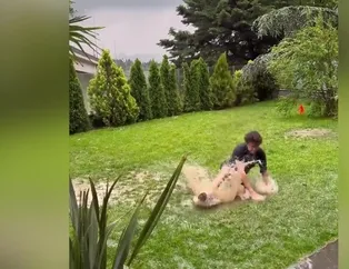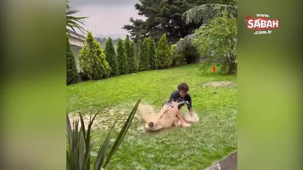Çağla Şıkel ve Emre Altuğ’un oğulları yağmurun tadını çıkardı! Çamurun içinde futbol oynadılar! | Video