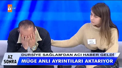 Son dakika haberi... atv'nin rakipsiz programı Müge Anlı ile Tatlı Sert canlı yayınında; Müge Anlı, kayıp 2 çocuk annesi evli Dursiye Sağlam'ın sevgilisi tarafından bıçaklanarak öldürüldüğünün ortaya çıktığını açıkladı. Müge Anlı, Dürsiye Sağlam'ın sevgilisinin cinayetin tüm ayrıntılarını polis sorgusunda itiraf ettiğini açıkladığı anlarda stüdyodaki konuklar şok yaşayarak gözyaşlarına boğuldu.