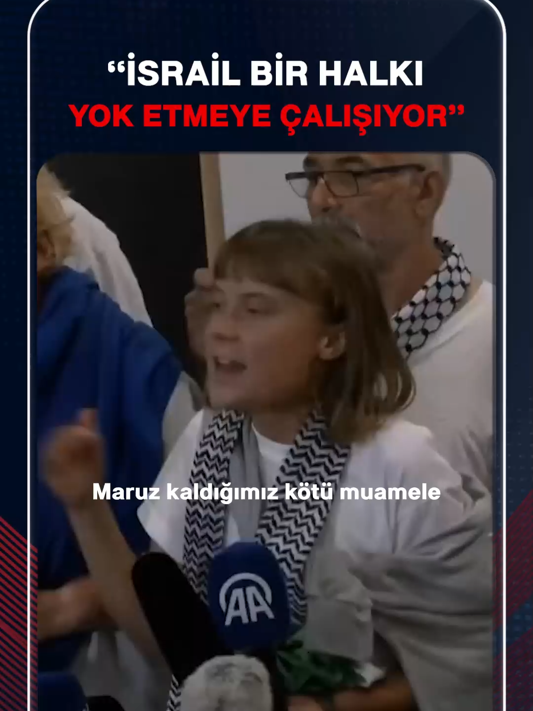 İsrail’in uluslararası sularda alıkoyduğu Küresel Sumud Filosu’nda bulunan Greta Thunberg, Eleftherios Venizelos Havalimanı’nda açıklamalarda bulundu: -Gözlerimizin önünde bir soykırım yaşanıyor. -Yaşadığımız kötü muameleleri, istismarları ve tutsaklığımızı çok uzun süre anlatabilirim. Ama mesele bu değil. -Burada olan şey şu: İsrail, soykırımı ve kitlesel yıkımı, tüm bir halkı gözlerimizin önünde silme niyetini daha da tırmandırırken, bir kez daha uluslararası hukuku ihlal etti; insani yardımların Gazze’ye ulaşmasını engelledi, insanlar açlıktan ölürken.