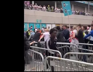 İngiliz taraftarlar, Wembley'e biletsiz giriş yapmak için güvenlik kapılarını aşıyor. Kalabalıkla başa çıkmak için yeterli sayıda polisin olmadığı belirtildi.