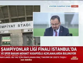 UEFA, yeni tip corona virüsü (Covid-19) nedeniyle ertelenen Şampiyonlar Ligi için kararını verdi. Devler Ligi'nde sekizli finalin Lizbon'da oynanacağını açıklayan UEFA, 2021 Şampiyonlar Ligi finalini ise seyircili olarak İstanbul'a verdi. Bu kararın ardından Gençlik ve Spor Bakanı Mehmet Kasapoğlu, Türkiye Futbol Federasyonu Başkanı Nihat Özdemir ve TFF Başkanvekili Servet Yardımcı ortak basın toplantısı düzenledi.