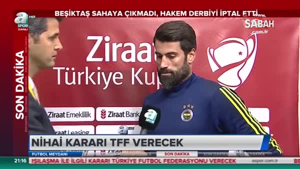 Fenerbahçe Kaptanı Volkan Demirel, Beşiktaş'ın sahaya çıkmamasını değerlendirdi. Maçın oynanması için ellerinden geleni yaptıklarını belirten Volkan Demirel, "Beşiktaş'ın verdiği karar kendilerini ilgilendirir. Biz üzerimize düşeni yerine getirdik. Maçın oynanması için elimizden geleni yaptık. Sahada sonuçlandırmak istediğimiz bir maçtı. Bu turu böyle geçmek istemezdik. Bunlar futbol adına güzel şeyler değil her şeyin sahaya kalması lazım. Bana taşlar sopalar direkler sökülüp atıldı rakı şişesi atıldı. Hiçbiri gelmedi ama gelse de devam ederdim." dedi.