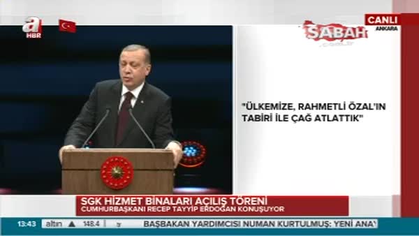 Cumhurbaşkanı Recep Tayyip Erdoğan, Cumhurbaşkanlığı Külliyesi'nde, Çalışma ve Sosyal Güvenlik Bakanlığınca yapımı tamamlanan SGK hizmet binalarının toplu açılış töreninde konuştu.