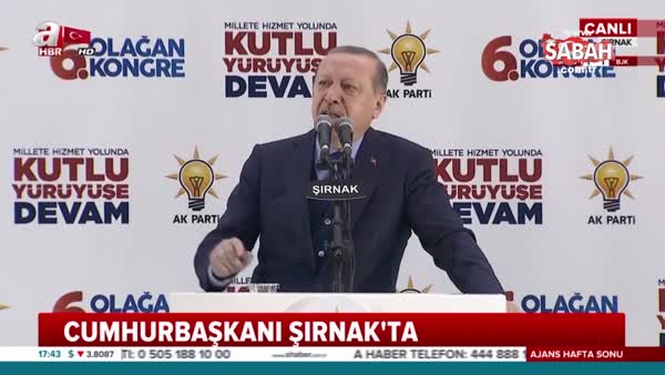 Cumhurbaşkanı Recep Tayyip Erdoğan, AK Parti Şırnak İl Kongresi'nde konuştu. Cumhurbaşknaı Erdoğan konuşmasında, "Filistinli kardeşlerimizin kanını dökmek için fırsat kollayanlar utanmadan sıkılmadan densiz beyanlarda bulunuyorlar. Kontrol ettikleri basın yayın organlarındaki kiralık kalemler ve beslemeleri aracılığıyla bizi susturabileceklerini sanıyorlar. Birileri gibi tehditler karşısında teslimiyet göstereceğimizi düşünüyorlar. Bunlar bizi hiç tanımıyorlar. Biz her zaman ne diyoruz. Mert direnir, namert kaçar... Korkaklar zafer anıtı dikemez. Yumuşak başlı ise kim demiş uysal koyunum, aldırırım çiğnerim, hakkı tutar kaldırırım, zalimin hasmıyım ama severim mazlumu... Peygamberler şehri Kudüs'ü kan gölüne çevirmek isteyenlere asla izin vermeyeceğiz" dedi.
