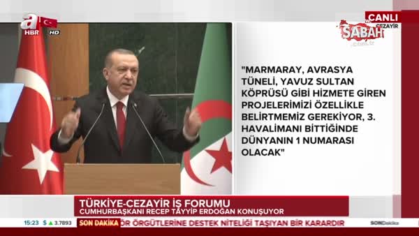 Cumhurbaşkanı Recep Tayyip Erdoğan, resmi temaslar için gittiği Cezayir'de katıldığı Türkiye-Cezayir iş forumunda açıklamalarda bulundu. Cezayir'le ticaretin gelişeceği mesajını veren Erdoğan, "Yeni gıda, tekstil ve demir çelik konusunda Cezayir önemli bir potansiyele sahip. İşadamalarımızın Cezayir'deki çalışmaları ne kadar kolaylaşırsa karşılıklı ticaretimiz de o kadar artacaktır. Enerji alanında ortak projeler geliştirmeliyiz. Bu alanda yatırım yapacak işadamlarına biz gerekli desteği vermeye hazırız"dedi. Erdoğan, konuşmasında Cezayirli bir enerji şirketiyle bir Türk enerji şirketinin Adana'da petrol kimya tesisi kurmak için 1 milyar dolarlık bir anlaşma imzaladığının müjdesini de verdi.