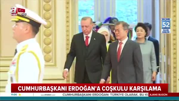 Cumhurbaşkanı Recep Tayyip Erdoğan, Güney Kore Cumhurbaşkanı Moon Jae-in tarafından resmi törenle karşılandı. "Mavi Ev" olarak bilinen Cumhurbaşkanlığı Sarayı'ndaki karşılama töreninin yapıldığı salona Cumhurbaşkanı Erdoğan ve eşi Emine Erdoğan, Güney Kore Cumhurbaşkanı Moon ve eşi Kim Jung-sook ile geldi. Erdoğan ile Moon tören kıtasını selamladıktan sonra, eşleriyle beraber tören alanındaki yerlerini almalarının ardından Türkiye ve Güney Kore milli marşları çalındı. Daha sonra iki lider, heyetlerini birbirine takdim etti. Başkent Seul'deki Cumhurbaşkanlığı Sarayı'nda, Cumhurbaşkanı Erdoğan ile Güney Kore Devlet Başkanı Moon yaklaşık bir saat süren baş başa görüşme gerçekleştirdi.