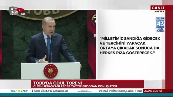 Cumhurbaşkanı Recep Tayyip Erdoğan, TOBB Hizmet Şeref Belgesi Takdim Töreni'nde konuşuyor. 24 Haziran seçimleri ve ekonomideki gelişmeler üzerine önemli mesajlar veren Erdoğan, "Şimdi seçimi dillerine dediler, piyasayı etkileyecek diyorlar, birşey olmayacak. Daha önce 12 seçimde ne olduysa ne olacak. Milletimiz sandığa gidecek ve tercihini yapacak. Ortaya çıkan sonuca da herkes rıza gösterecek. Önemli olan kimin ne dediği değil, milletimizin sandıkta nasıl bir irade ortaya koyduğudur. Milletime sen bize mecbursun ifadesini kullanma saygısızlığı göstermem o ifade satın alınamaz. Birileri 15 vekili bir yerlere gönderebilir, biz yapamayız. Ağlaya ağlaya gittiler, güle oynaya geldiler. 24 Haziran'da milletim bu oyunları çevirenlerin oyunlarını bozacaktır" dedi.