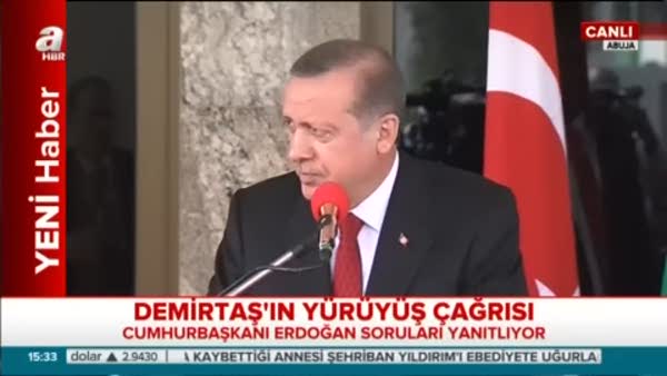 Erdoğan, Demirtaş'ın yürüyüş çağrısına ilişkin; Bölge halkımız ve Kürt kardeşlerimiz davete evet demez. Suç duyurusunda bulunmaya gerek yok savcılarımız üzerine düşeni yapmalı.