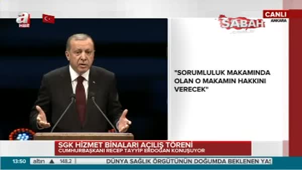 Cumhurbaşkanı Recep Tayyip Erdoğan, Cumhurbaşkanlığı Külliyesi'nde, Çalışma ve Sosyal Güvenlik Bakanlığınca yapımı tamamlanan SGK hizmet binalarının toplu açılış töreninde konuştu.