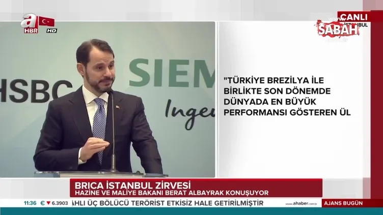 Hazine ve Maliye Bakanı Berat Albayrak, BRICA İstanbul Zirvesi'nde önemli açıklamalarda bulundu. Bakan Albayrak "Türkiye, Brezilya ile birlikte son dönemde dünyada en büyük performansı gösteren ülke oldu. Türkiye'nin kaynak sağlama sorunu yok, dünyanın en güçlü ülkelerinden biri. Sadece toparlanmada dünyada ilk 3'teyiz. Felaket senaryosu üretmeye çalışanlara, bu algıda olanlara tahvil ihracıyla gerekli dersi verdik. Hayata geçirdiğimiz tedbirler yatırımcılar tarafından gayet olumlu karşılanmıştır. Durmayacağız, kesinlikle gevşemeyeceğiz politikalarımızı hayata geçirmeye kararlılıkla devam edeceğiz. Türkiye yeni bir ekonomi başarısı yazmaya başlamıştır. Küresel sistemdeki tüm ülkelerle güçlü siyasi ve ekonomik ilişkilerimizi daha da ileriye taşımak istiyoruz" dedi.