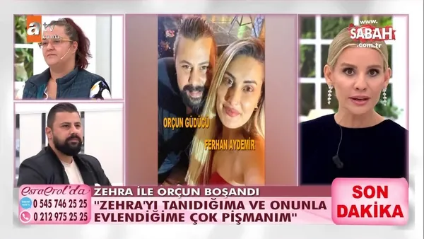 ATV’nin ilgiyle izlenen ‘Esra Erol’da’ programında bu hafta yine akıllara durgunluk veren bir olay yaşandı. Esra Erol’un programına katılan Zehra Hanım, ünlü sunucudan boşanmak için yardım istedi. Eşi Orçun’un evliyken başka bir kadınla evlendiğini belirten Zehra Hanım, canlı yayında eşiyle yüzleşti. Orçun Bey’in ‘çocuklarımın annesi olarak da görmüyorum’ sözü sonrası Esra Erol çileden çıktı. Ünlü sunucu Orçun Bey’i stüdyodan kovdu!