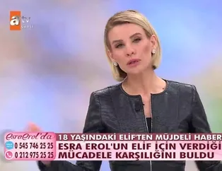 ATV’nin beğenilen ve en çok izlenen reyting rekortmeni programı ‘Esra Erol’da’, her hafta farklı konular ve konuklar ele alınıyor. Bugün Esra Erol’un programında Türkiye’nin gündemine oturan Elif Yıldırım’ın konusu işlendi. Geçtiğimiz günlerde 18 yaşındaki Elif Yıldırım'ın 40 yaşında, evli ve çocuklu Kadir Akkoyun'a kaçması tüm Türkiye'nin gündemine oturmuş ve çok ses getirmişti. Sosyal medyada da çok konuşulanlar arasına giren olayda bugün yeni bir gelişme yaşandı. Dün programda ailesine dönmek istemediğini ve sevgilisi Kadir Akkoyun’la yaşamak istediğini söyleyen Elif Yıldırım’dan bugün sevindiren bir haber geldi. Esra Erol’un çabaları sonucu Elif ikna edildi ve ailesinin yanına dönmek istediğini belirtti. İşte ayrıntılar!